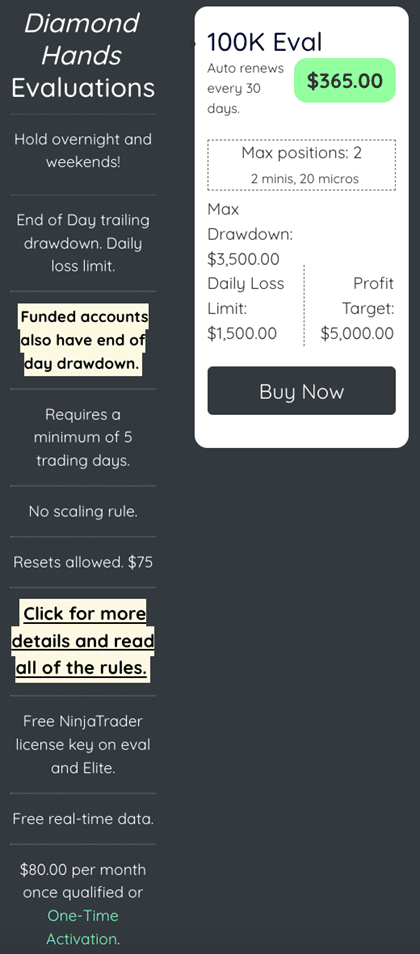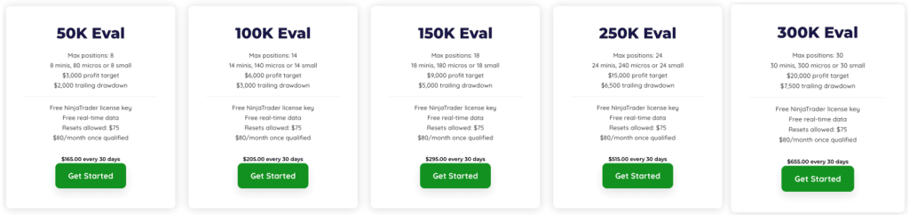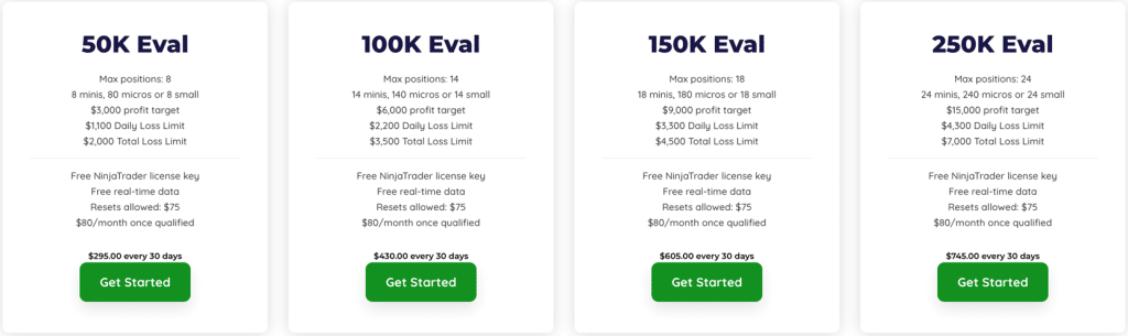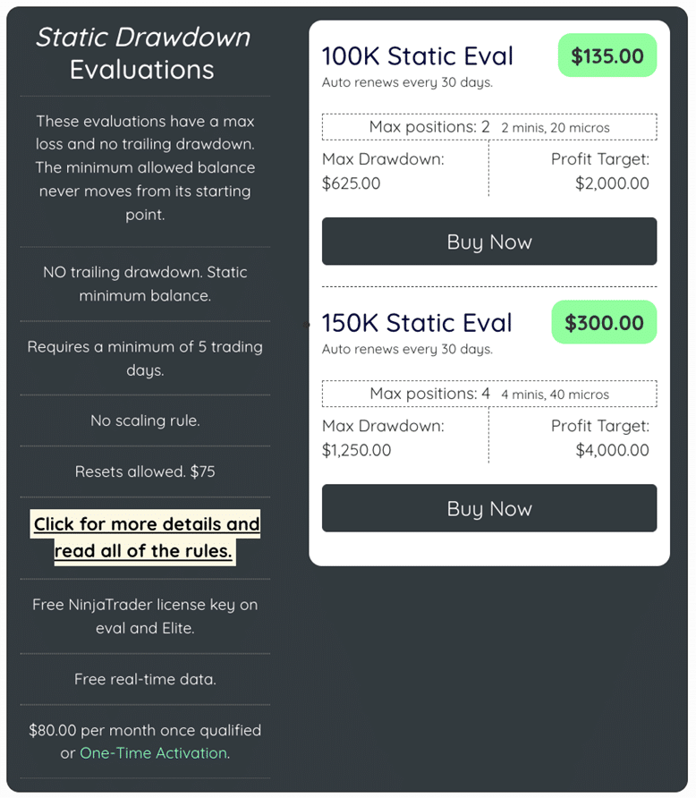The futures prop firm also provides an optional $75 evaluation reset, which allows traders to restart if they reach the maximum drawdown limit.