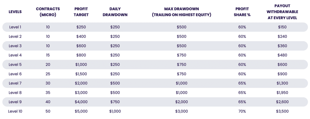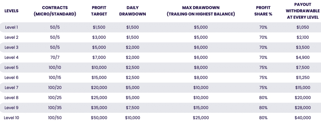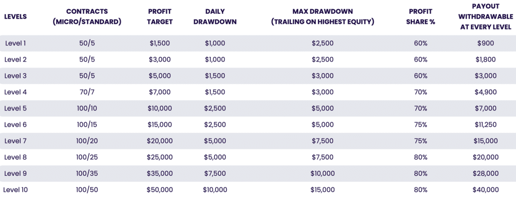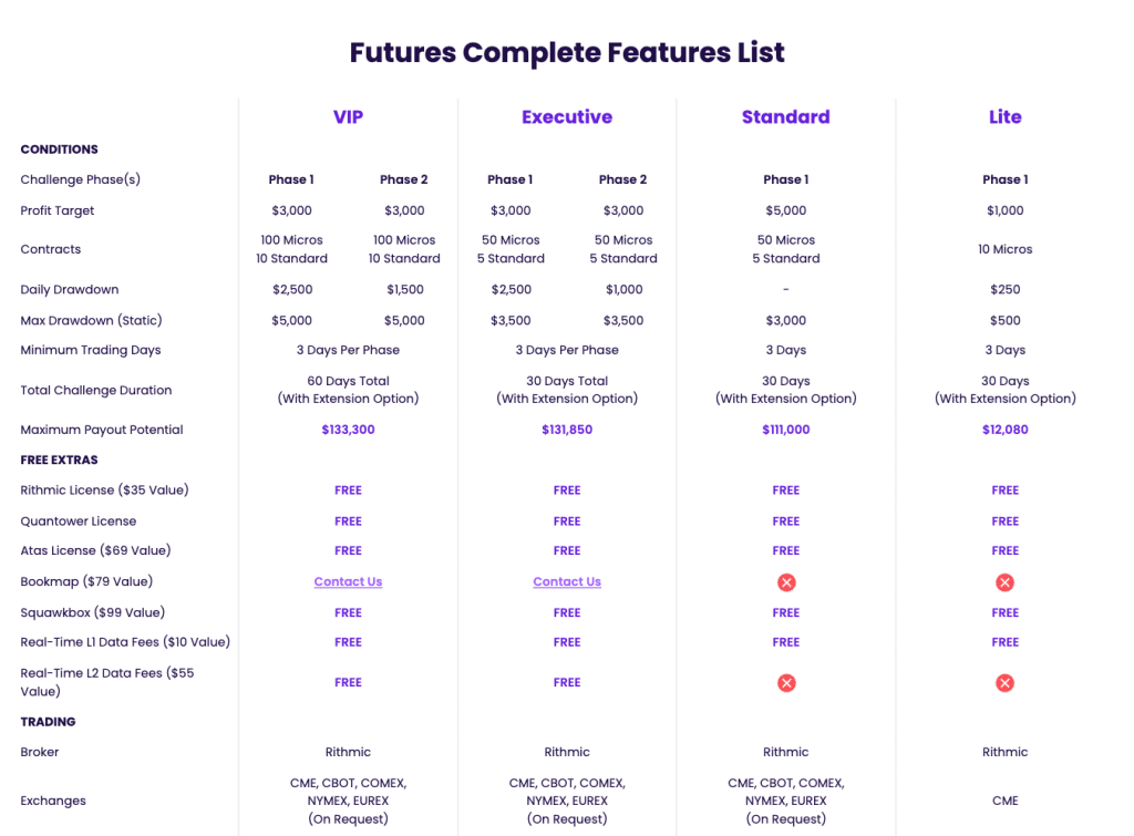 In contrast to the forex CFD Challenges, futures challenges comprise two stages. The first imposes stricter criteria for success than the second, requiring traders to demonstrate a higher level of skill and discipline before they qualify for funding. Similarly to forex traders, futures traders have a number of accounts to decide between, each with their own starting capital and rules. We take a look at each account in more detail below.