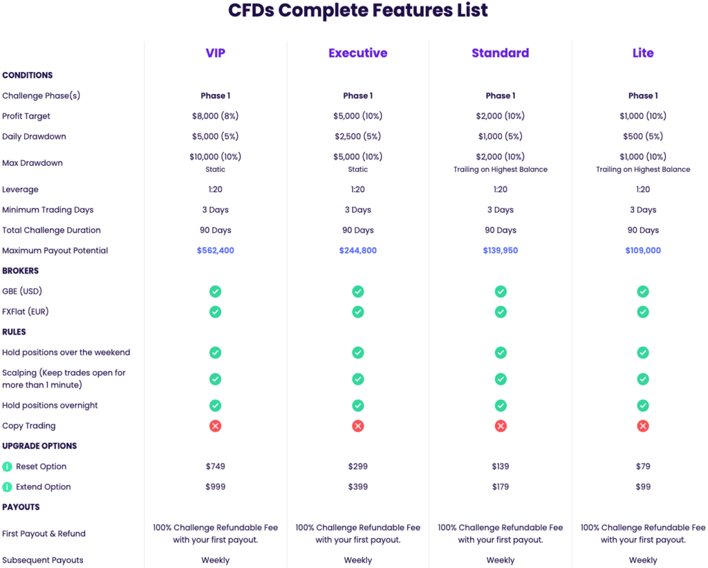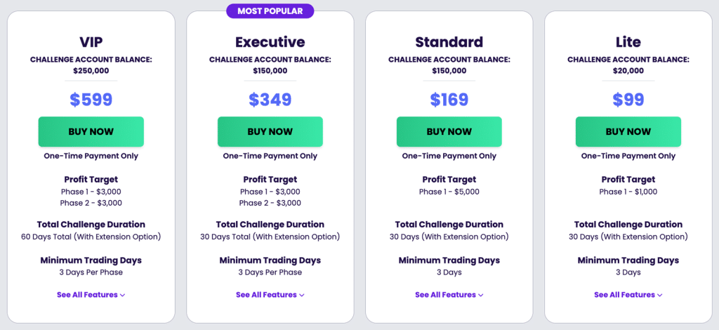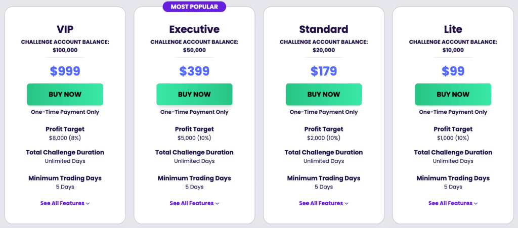 Traders choose from four types of challenge accounts: Lite, Standard, Executive, or VIP. Each challenge account comes with its own starting balance, growth potential, and regulations.