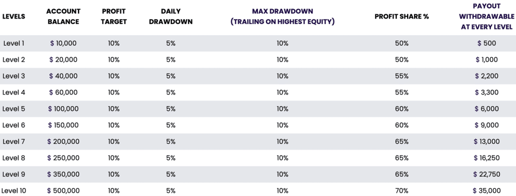 When you successfully pass each Challenge, you will be directed to the corresponding Scaling Plan, which for the VIP Account are listed in the table below.