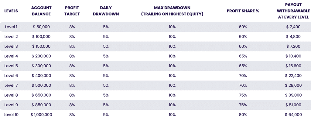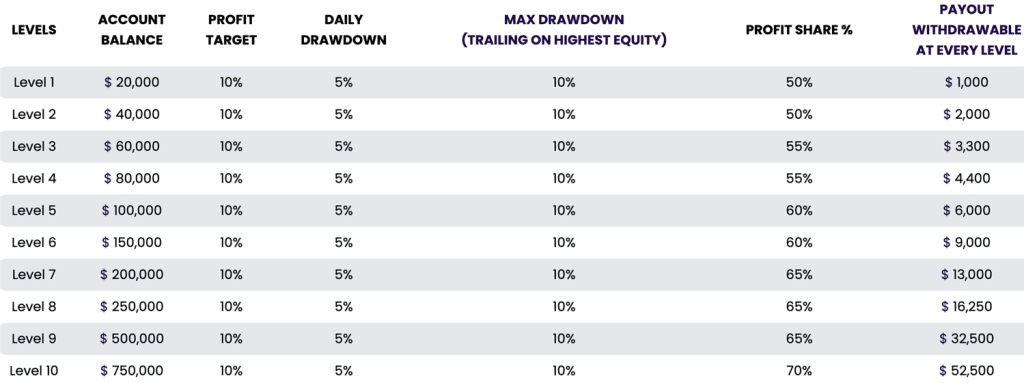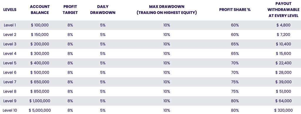 When you successfully pass each Challenge, you will be directed to the corresponding Scaling Plan, which for the Executive Account are listed in the table below.